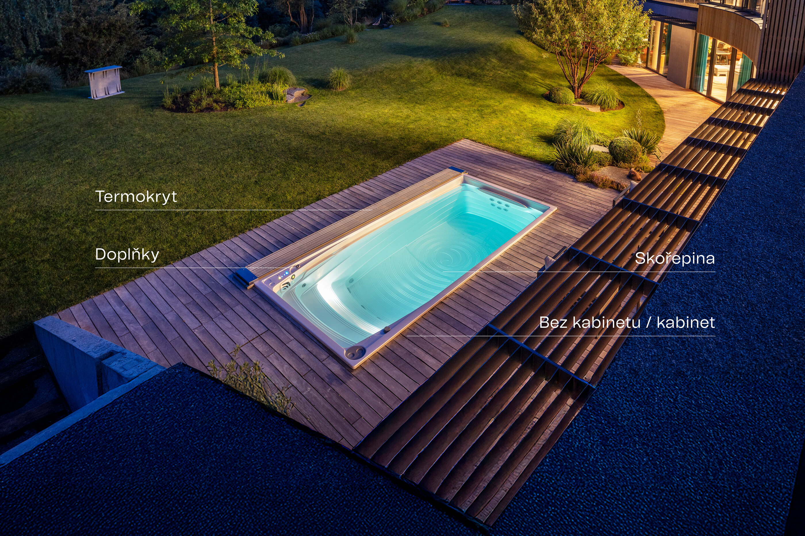 Termokryt je klíčovou součástí izolačního systému swim spa. Díky třem dostupným variantám materiálového provedení termokrytu snadno zvolíte řešení, které bude dokonale ladit s okolním prostředím.