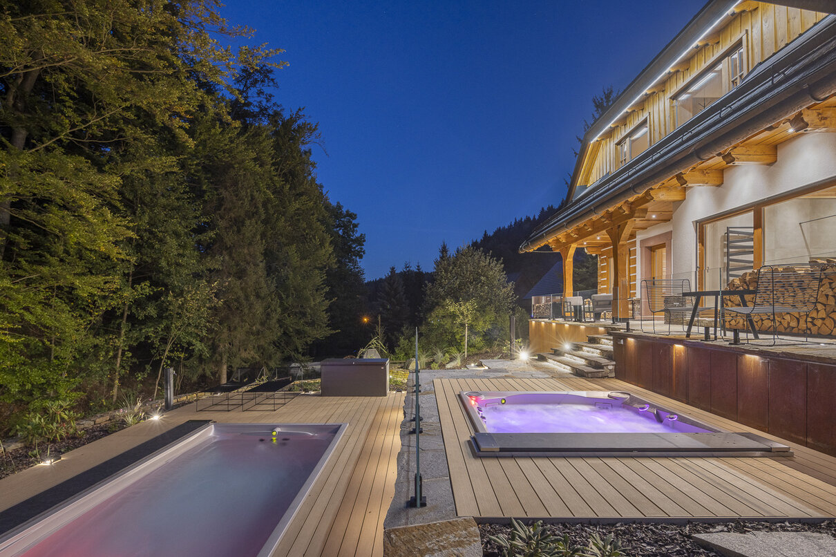 LoungeiN je určená k zapuštění do země, což umožňuje unikátní design interiéru se zabudovanými schody, které zároveň tvoří relaxační lavici. Výborně se tak ladí s architekturou domu i zahrady. LoungeiN je navržená ke kombinaci se Swim Spa XL a lze ji dokonce vybavit automatickým termokrytem ACS®.