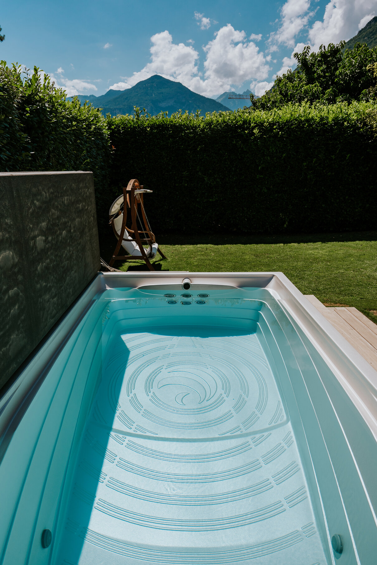 Swim Spa M poskytuje prostor pro příjemné rodinné chvilky i individuální plavecký trénink. Může jednoduše stát v kabinetu na zpevněné ploše nebo ji můžete zapustit do země.